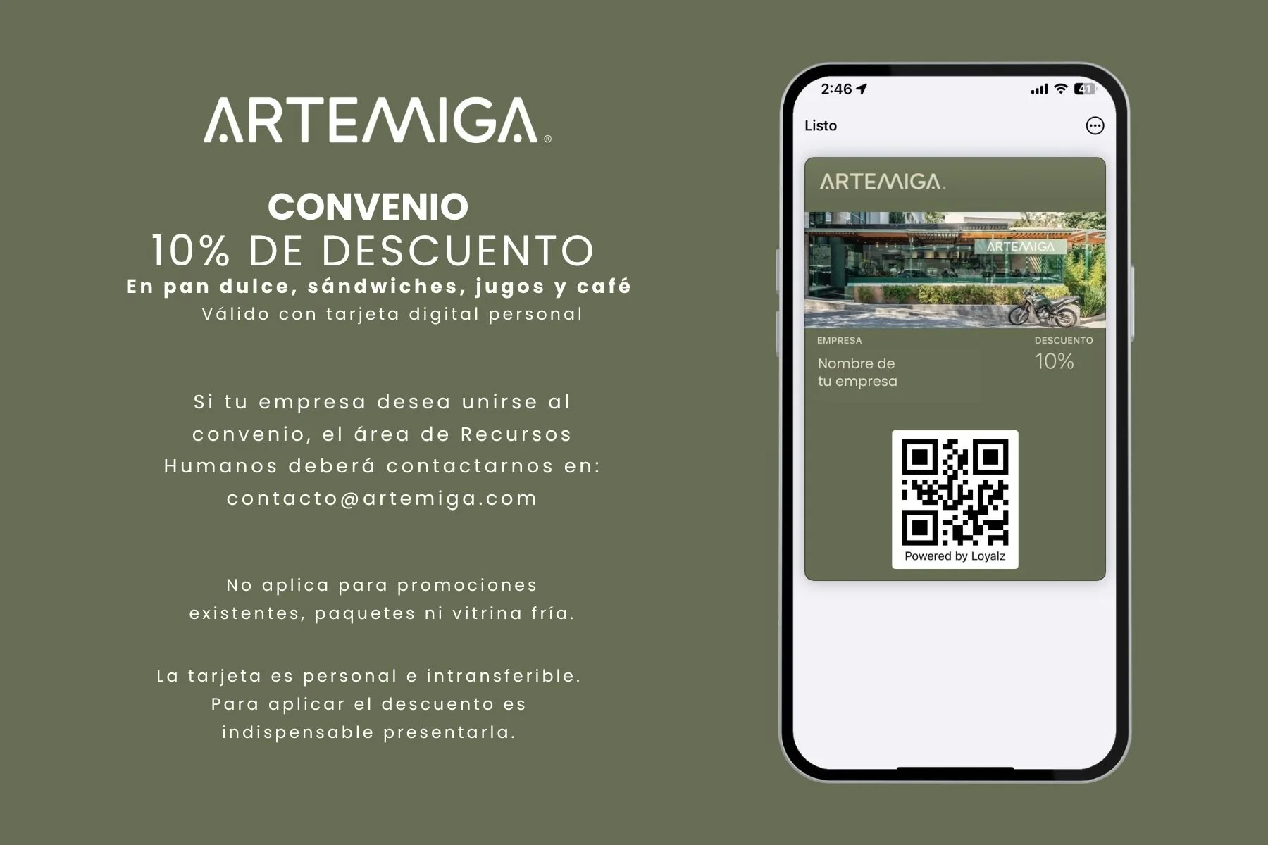 Artemiga cuenta con un convenio empresarial, el cual debe gestionarse directamente a través del área de Recursos Humanos de las empresas interesadas en participar.